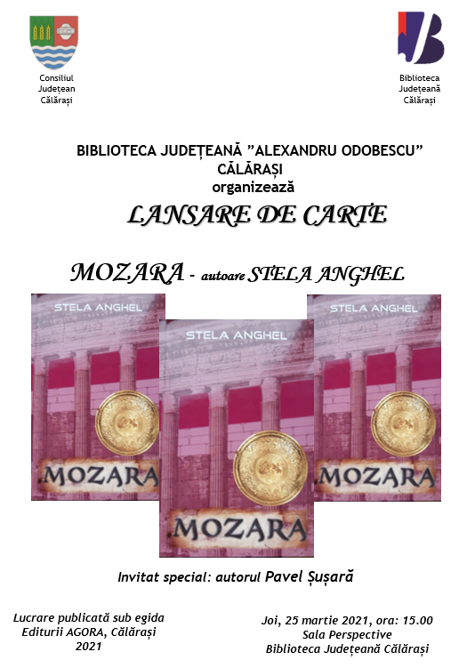 Biblioteca Județeană ”Alexandru Odobescu” din Călărași vă invită să participați la un eveniment cultural organizat cu sprijinul Consiliului Județean Călărași, prilejuit de apariția volumului MOZARA al autoarei STELA ANGHEL, profesoară de limba și literatura română, redactor de carte, autoare a mai multor lucrări dintre care menționăm Glosar barbian-babilonian, Editura Agora, Călărași, 2002; Proteză pentru îngeri, Editura Agora, Călărași, 2002; Zapping pentru Nobel, Editura Arienta, Calărași, 2013; Vânătorii de stele, Editura Semne, București, 2014, autoare (în colaborare) de programe școlare pentru gimnaziu în țară și străinătate.