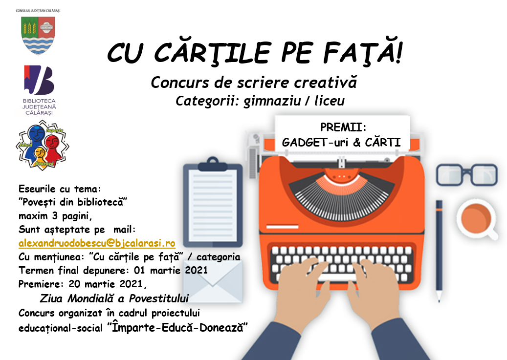 În cadrul proiectului educativ-social ”Împarte-Educă-Donează” -„Educația online…de la teorie la practică”, în parteneriat cu Asociația EM, Crucea Roșie Călărași și Școala Gimnazială Nr. 1 Vlad Țepeș, elevii de gimnaziu și liceu din județul Călărași sunt invitați să aștearnă pe hârtie propria poveste despre relația lor cu biblioteca. Premierea va avea loc pe 20 martie 2021, de Ziua Mondială a Povestitului. Vă dorim spor și creativitate!