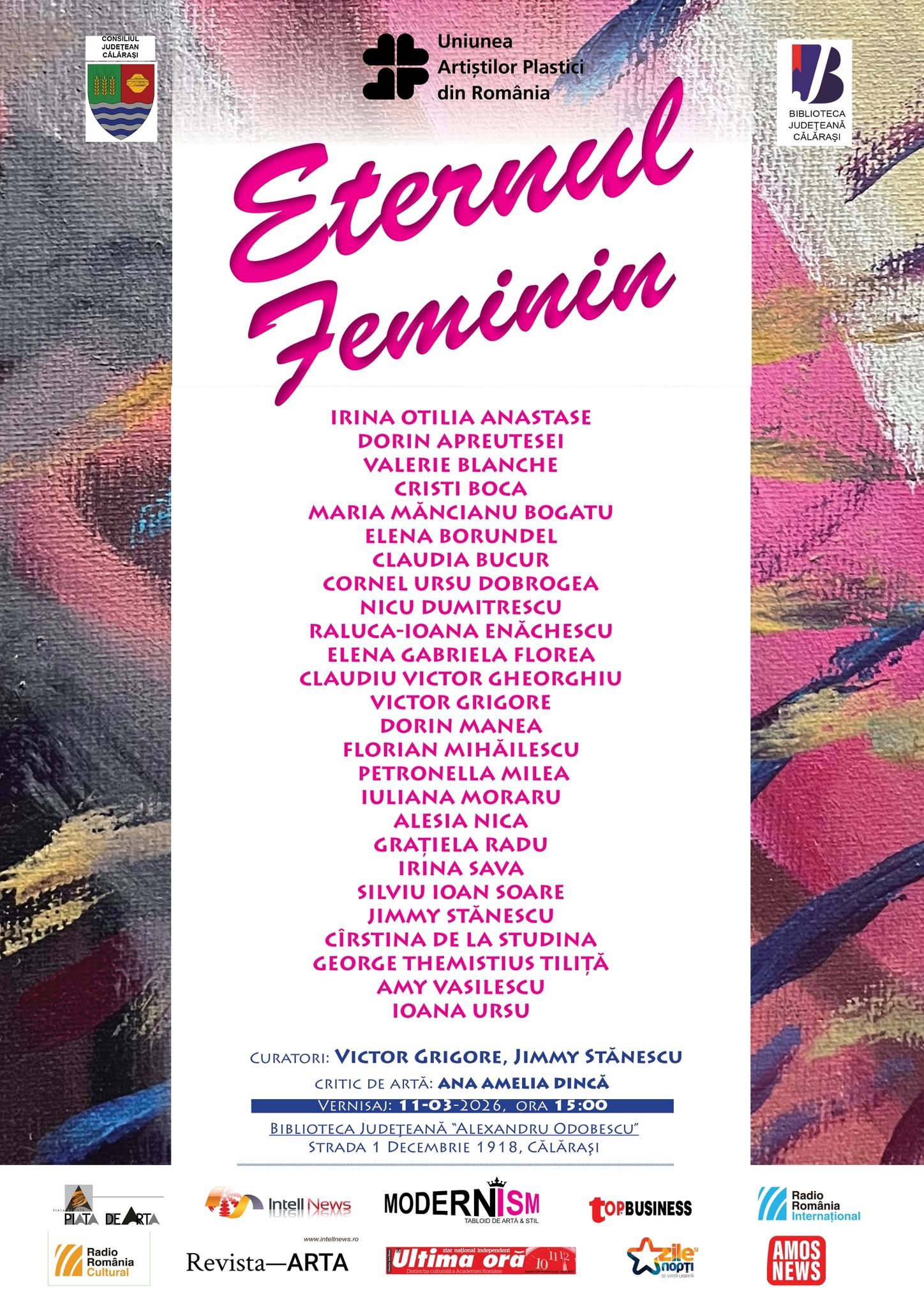 Consiliul Județean Călărași, prin Biblioteca Județeană, vă invită miercuri, 11 martie 2026, ora 15:00, la vernisajul expoziției de pictură „Eternul Feminin”, un eveniment artistic devenit deja tradiție în luna martie.