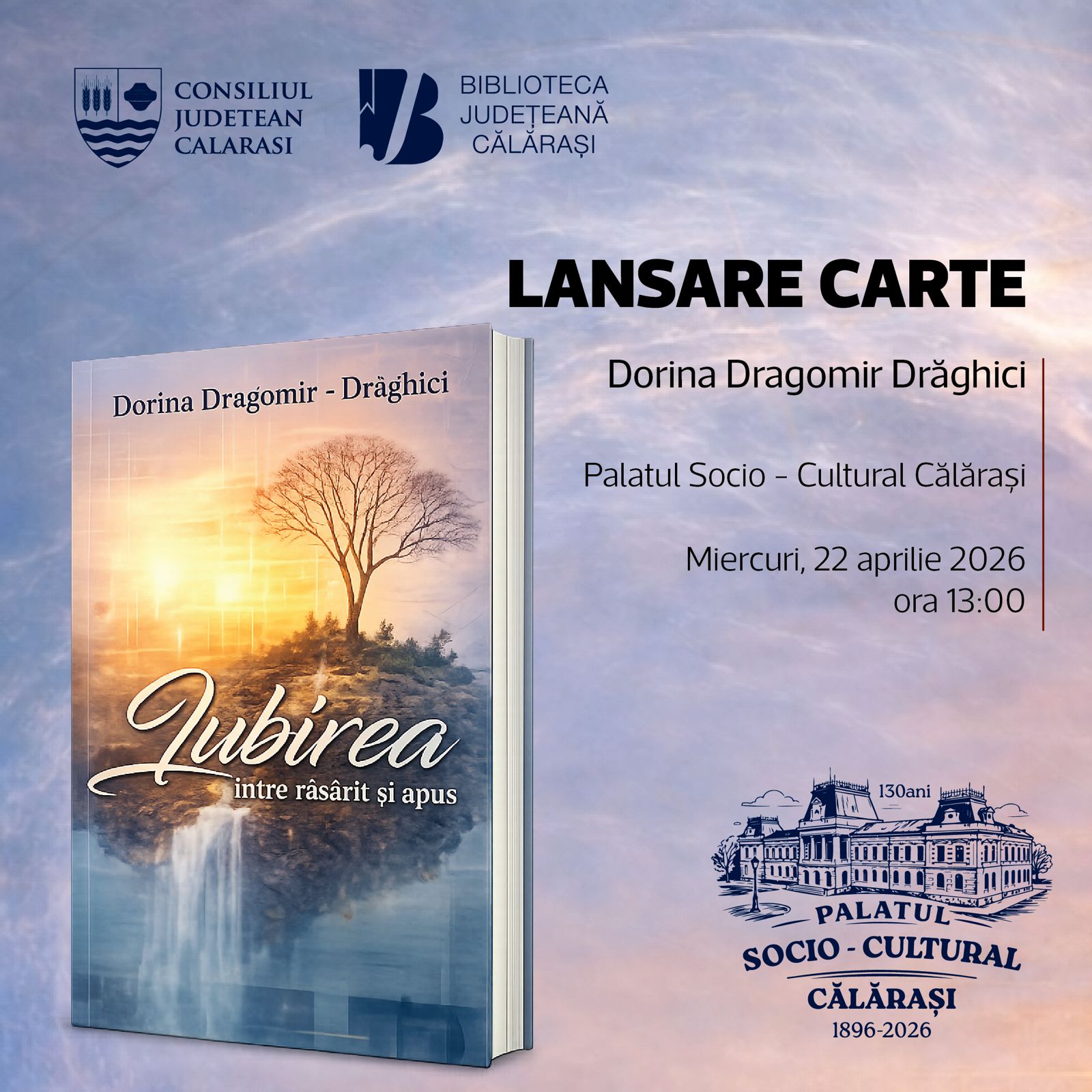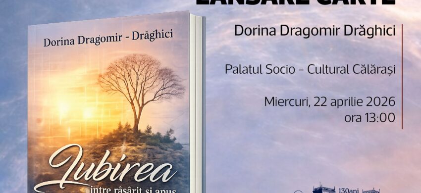 Biblioteca Județeană „Alexandru Odobescu” Călărași, vă invită la un eveniment deosebit, într-o atmosferă plină de sensibilitate și emoție: lansarea celui de-al doilea volum de versuri semnat de Dorina Dragomir Drăghici – „Iubirea între răsărit și apus”.