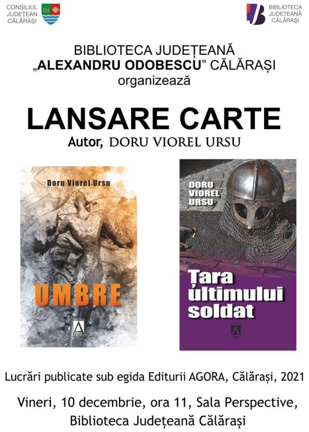 Biblioteca Județeană ”Alexandru Odobescu” din Călărași vă invită să participați la un eveniment cultural organizat cu sprijinul Consiliului Județean Călărași, prilejuit de apariția volumelor UMBRE și ȚARA ULTIMULUI SOLDAT, volume ale autorului DORU VIOREL URSU, politician român și avocat, fost membru al Frontului Salvării Naționale, ministru de interne al României în perioada 16 iunie 1990 – 16 octombrie 1991.